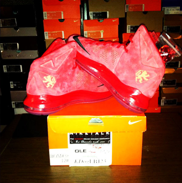 早在2月份的时候,勒布朗 詹姆斯就在对阵雷霆队的时候上脚过一双麂皮版本的 Nike Lebron 10,很多朋友被那款麂皮材质的战靴深深吸引。此番,网络上曝光了一款全新的红色麂皮版本 Nike LeBron 10 EXT 谍照,从照片中我们可以看出,这款 Lebron 10 通体采用了红色打造,配以黑色的 Swoosh 以及金色的狮子 Logo,整款鞋的配色十分抢眼。相信这款版本将会以市售的形式出现,有兴趣的朋友可以耐心等待一下。