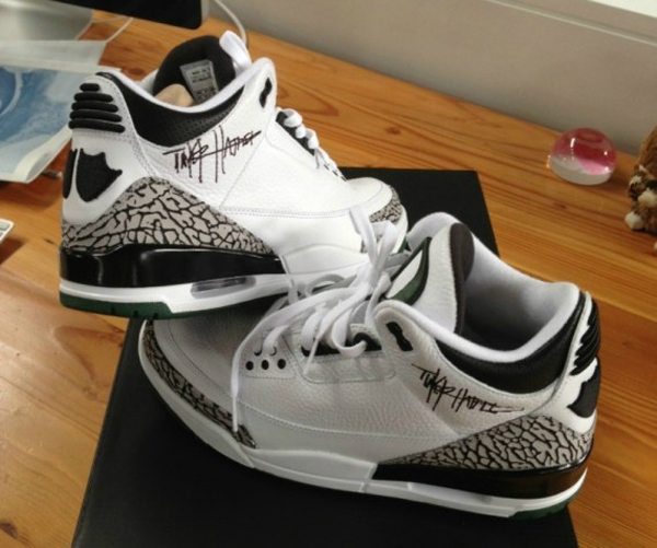 俄勒冈大学和 Nike 公司有着不可分割的联系,所以俄勒冈鸭队的周边产品总是丰富多样而让人向往,此次给大家带来这款球鞋是 Air Jordan 3 俄勒冈鸭队版本,此鞋款最特别之处在于鞋身后侧方有一个人的签名,他就是 Nike 著名设计师 Tinker Hatfield 的签名,此鞋款现已在ebay上公开拍卖,想要的朋友们赶紧去看看吧。