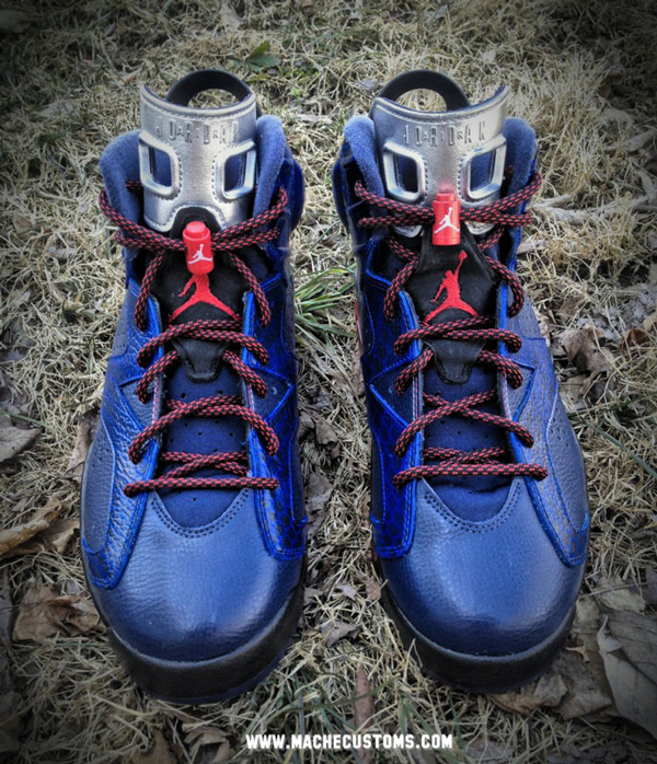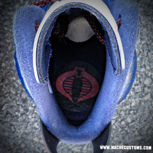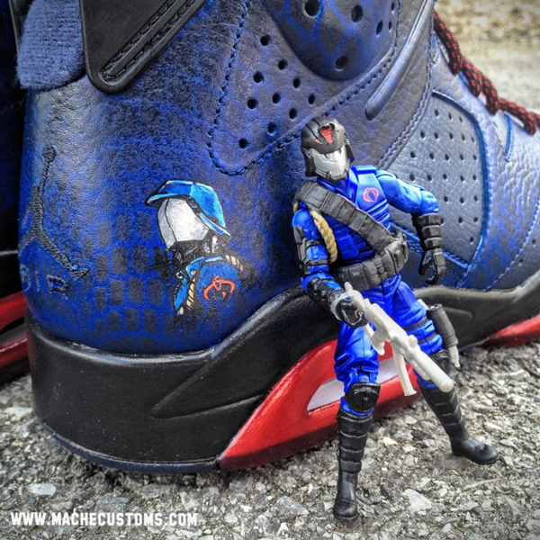 此次我们给大家带来了 Mache 自己又一款定制大作,以Air Jordan 6 奥运配色为蓝本创作的鞋子,鞋面灵感来源于“眼镜蛇指挥官”,鞋面涂鸦蓝色光泽蛇皮细节纹路,鞋舌涂成镀铬配色,加上一个红色半透明大底。鞋后侧还有“眼镜蛇指挥官”头像LOGO,大家觉得如何呢?喜欢的话可以去 machecustoms.com 定制网站看一看哦。
