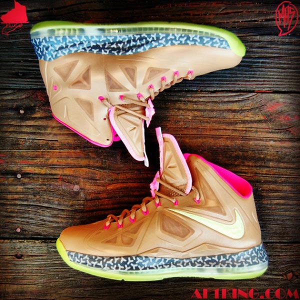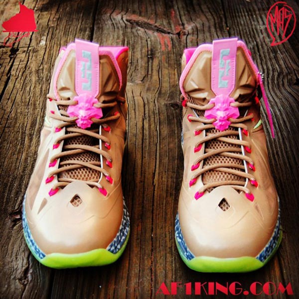 此次又为大家带来一款全新的 Nike LeBron 10全新定制版本,此鞋款绘画的灵感来源于Air Yeezy ,定制品牌 GourmetKickz 为 Nike LeBron 10做的,鞋面搭配棕褐色为主色调,加上骚粉点缀,鞋底以及 Nike 的LOGO 更有夜光的材质添加,让此鞋款在王者之气上更添几分时尚感,大家觉得如何呢?与其他LeBron 10 相比那双好看呢?