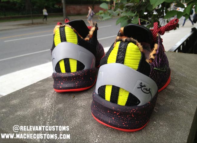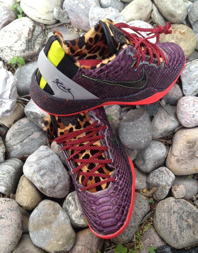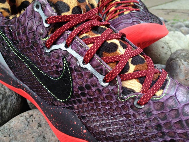 球鞋定制大师 Mahce 又有瞩目新作!此番,Mache 为大家带来了一款 Nike Kobe 8 “The Real What the Kobe 8″,这双 KOBE 8 个人定制汇集了曾出现在 Kobe 7 上的“猎豹”、“鲨鱼” 、“狼灰”配色等灵感,以紫色蟒蛇鳞片质感的鞋面为基础,配以毛绒质感的豹纹鞋舌以及内衬,鞋身上的 Swoosh 则以黑色蛇纹材质制成。而鞋舌上的 Logo 更是特别,Mache 将几种动物的压花图案均汇总到了鞋舌之上,以此表明这款 “The Real What the Kobe 8″ 的疯狂之处。