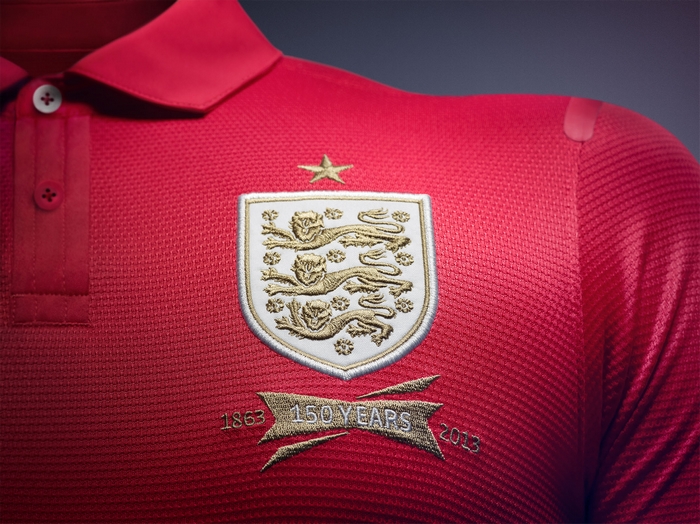 耐克新款英格兰国家队客场球衣唤起了对英格兰国家队悠久的历史记忆,激发出国家荣耀感,彰显独特的足球风格。英格兰国家队客场球衣于1951年首次亮相球场,英格兰队更在1966年的温布利球场穿着红色球衣问鼎世界杯。新款客场球衣将现代与经典结合,纯红色的设计表达了英格兰忠诚球迷们的自豪感与激情。同时,剪裁考究的衣领体现了英格兰独特的传统朴素风格。衣领开口处的两颗纽扣,上白下红,白色纽扣上的红线巧妙地呈现了圣乔治十字。为了纪念英格兰足总成立150周年,客场球衣上标志性的“三狮”队徽被着以金色,其上方的一颗金星代表英格兰勇夺1966年世界杯的荣耀。队徽下方的金色丝带图案则带有“1863-2013,150周年”纪念字样。白色短裤的正面同样带有金色队徽,红色球袜的上部则带有白色细条纹。这款球衣不仅体现了耐克对于风格,工艺和自豪感的追求,更能凭借其科技方面的特点帮助球员们提高场上表现。