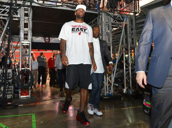 在昨天的东部决赛抢七大战中,迈阿密热火大胜步行者,有惊无险地与马刺会师总决赛舞台。而在比赛之后的颁奖仪式中,勒布朗 詹姆斯则出人意料的换上了一双红色的 Nike Air Foamposite One 出席,而不是穿着 Lebron 系列鞋款,有点令人感到意外。不过 Air Foamposite One 霸气的肌肉感鞋身也与小皇帝的气质非常符合。