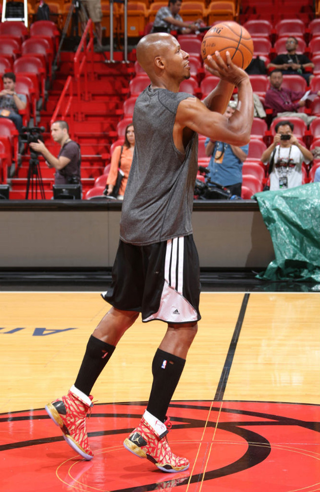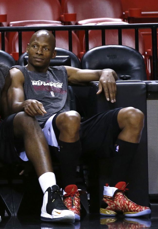 Jordan Brand 本周为旗下代言人 雷 阿伦准备了四双总决赛 PE 版本的 Air Jordan 28,在首战中,雷 阿伦也穿上了主场版本。而在今天的公开训练中,君子雷又提前为我们亲身示范了客场版本的 Air Jordan 28 总决赛 PE。不知道明天的总决赛第二场大战,君子雷能否延续第一场的精彩表现呢?