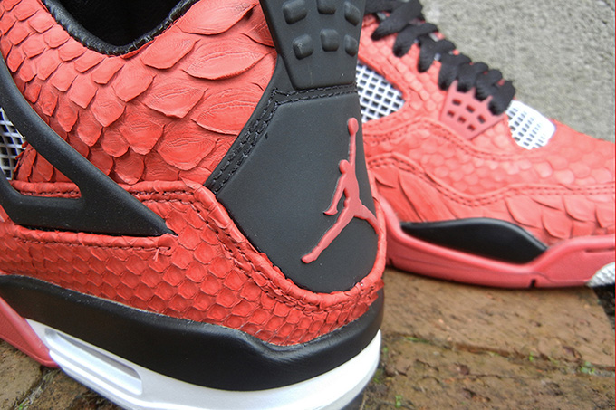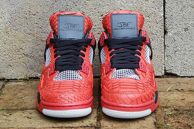 球鞋定制团队 JBF Customs 近日又带来新作,此次其以一双即将发售的 Air Jordan 4 全红配色为蓝本,再以全红色的仿蟒蛇纹材质覆盖鞋身主体,而鞋舌上则搭载了 JBF Customs 自制的个人标签,鞋款内衬则以奢华的皮革材质打造,极为狂野。这么一款“红蟒”,JBF Customs 此次打算出售5双。