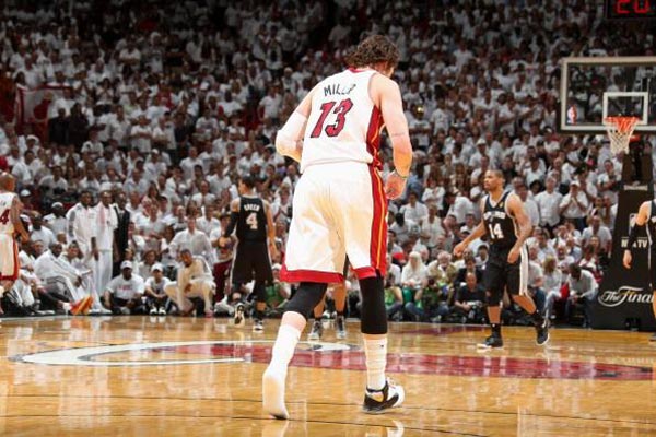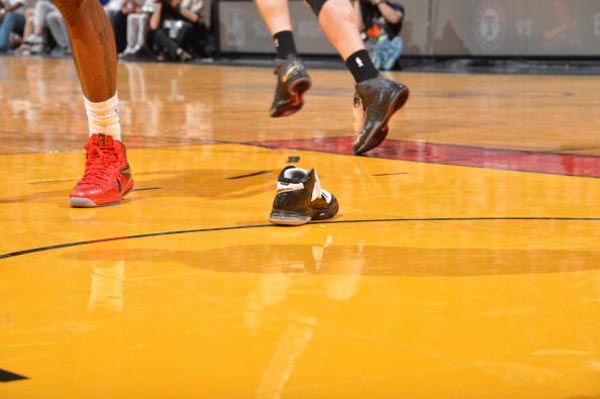 在今天的总决赛第六战中,迈阿密热队的老将迈克 米勒完成了一记惊世骇俗的表演。他在左脚球鞋掉落的时候直接将球鞋扔出场外,并且在之后的一次进攻中命中一记三分。虽然雷阿伦在常规时间终场前完成了一记载入史册的三分球,但是米勒的这一神奇演出也值得我们回味。大家看得出米勒穿的是什么鞋么?