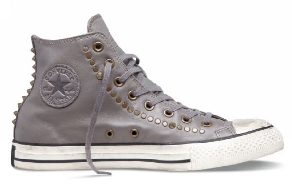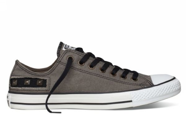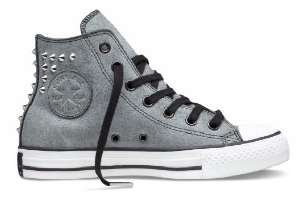 铆钉的重口味演绎,各种铆钉及金属件的运用和镶嵌,将时尚元素演绎出不失纯正洒脱的摇滚味道,无论配合帆布或是皮质,都是抢眼的必备杀手。暗黑色系的泼油皮革与上乘帆布为基调,设计师以CHUCK TAYLOR ALL STAR最为经典的鞋体走线为路径,点缀平头撞钉、小尖头铆钉以及金字塔方钉,闪现朋克精神狂野不羁之外的精巧细节。