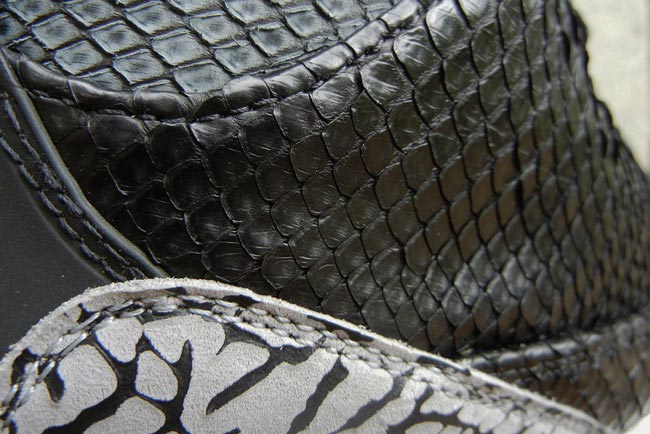 前不久球鞋定制团队 JBF Customs 为我们带来过一款 Air Jordan 4 "红蟒" 个人定制版球鞋,此次其又打造了一款以蟒蛇纹为主题的定制球鞋,这款 Air Jordan 3 “Black Python” 以黑爆裂版本为设计蓝本,设计师将鞋款鞋身以及鞋舌均换成了鳞片质感的蟒蛇纹材质,给人带来一种不寒而栗的感觉。