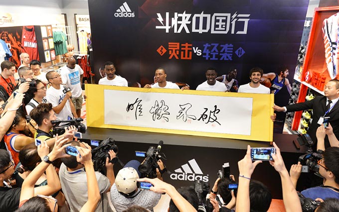 卢湾中学活动之后,秉承斗快中国行的理念,四位球星马不停蹄地从卢湾中学前往上海品牌中心,为等候在那里的之前购买了Crazy Quick和adizero Crazy Light 3的忠实上鞋迷签名。球迷们拿着签有四位球星签名的球鞋喜笑颜开,兴奋不已。四位球星在上海品牌中心还继续献宝,向现场热切的球迷展示了在北京学会的“唯快不破”中国毛笔字书法。
