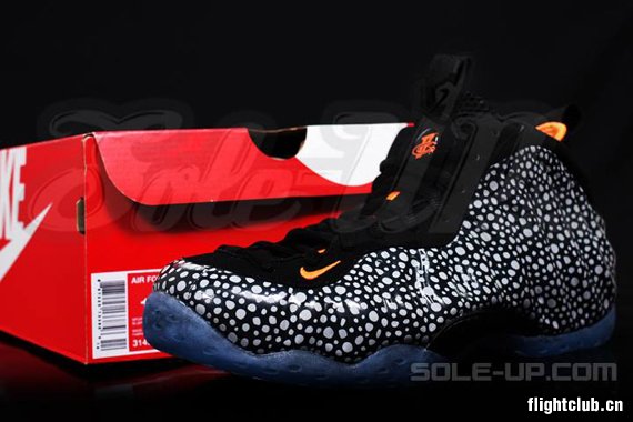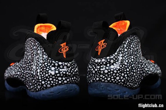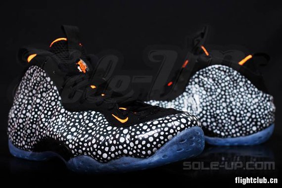 和 Nike Air Foamposite Pro Asteriod 小行星熔岩喷一起亮相的还有这款 Nike Air Foamposite One "Safari",我们暂时叫它“波点喷”。 今天带来更多清晰实物细节照片,和之前看到的一样,黑色鞋面上布满了不规则的白点,采用了透明的水晶鞋底,上脚效果应该十分抢眼! 货号:575420-003 目前在国外球鞋网店的售价为 $1499 美元!