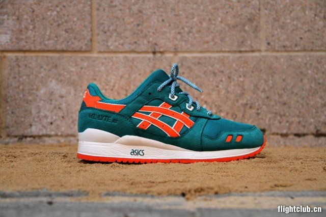 经典鞋款 ASICS GEL LYTE III 的迈阿密配色。麂皮材质搭配网眼布料,橙色的 ASICS 传统条纹,整体效果异常抢眼。
