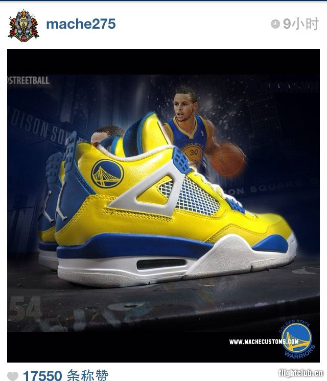 近日一位金州勇士队的球迷请到定制大牌 Mache 为其打造了一款 Air Jordan 4 “金州勇士” 个人定制版本,Mache 采用了勇士队标志性的蓝黄色覆盖鞋身主体,细节部分配以白色点缀,而鞋帮处则加载了勇士队的 Logo,虽然 Mache 在 Instagaram 上发布的这张图片以勇士队核心库里为背景,但是这款鞋与库里却没多大联系。