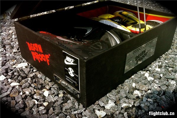 今天让我们一起来欣赏个人的定制中的又一力作,看我这个作品小编我得脑海中出现的词语是“艺术品”,不知道各位会不会和我一样呢?如果 Nike可以推出一个 Nike LeBron 系列的套装的话,那么个人定制大师们怎么就不能也推出一个呢?这次为大家带来的Nike LeBron 9 “Death Proof”个人定制套装灵感来源于由由昆汀·塔伦蒂诺和罗伯特·罗德里格斯导演的电影《死亡证据》。这是一部以变态杀人狂为题材的电影。值得一提的是,这部电影和一般冷血杀人犯使用凶器的传统凶杀案不同,影片中所有屠杀场面都是以汽车近乎疯狂地碰撞、辗压来完成的。鞋子以及鞋盒上都有该电影中经典的骷髅头LOGO,鞋面上的血浆作为以该电影作为灵感而出现一点也不意外。黑黄色的搭配也与电影中的福特车相契合,加上红色的内衬又为鞋子添亮不少。再加上定制的木质吊牌和定制鞋盒,实在称得起是“艺术品”了。请大家一起欣赏吧。