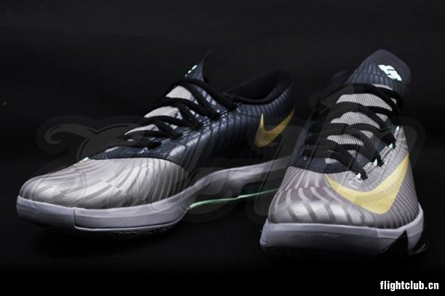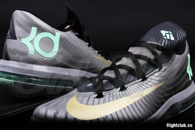 这款在昨天曝光了的 KD6 全新配色此番释出了实物图赏,这款配色以金属质感的银色打造鞋身主体,配以薄荷绿色的 Logo 以及细节点缀,鞋身上的 Swoosh 则以亮眼的金色打造,整款鞋的配色十分高端大气,目前还没有这款配色的市售信息,想要入手的朋友可以密切留意一下。