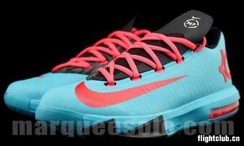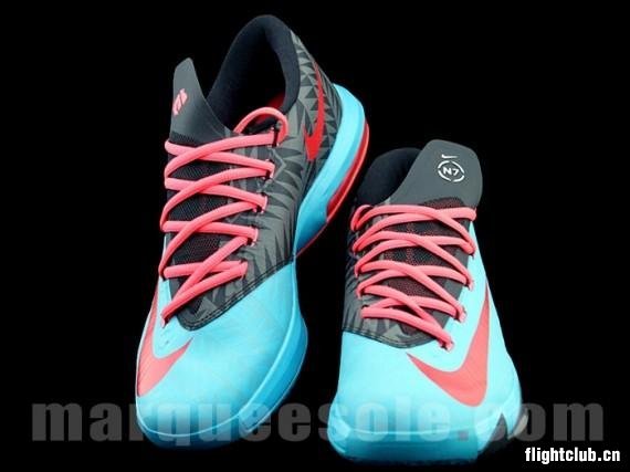 自从Nike把经典的N7配色移植到杜兰特签名鞋产品线以来,N7配色的Nike KD战靴都有着很不错的口碑,而近日marqueesole释出了Nike KD VI N7配色的详细图片,鞋款采用湖蓝色和黑色为主色,粉色作为辅色出现在鞋身Nike Swoosh、KD Logo、鞋带以及后跟Max Air单元处,整个鞋面均印有三角暗纹,鞋舌印有N7的Logo,目前这款鞋子还未更新任何官方发售的信息,不过相信不久即会与大家见面,请大家欣赏图片。 货号:626368-466