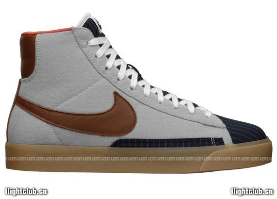 眼前这双Blazer Mid Premium同为“Nike Product Creation Experience”企划鞋款之一,灰色织物侧身搭配海军蓝色白条纹材质,内衬印染绚丽图案,后跟镭射特别的NPCE企划logo。9月7日正式上架,货号625908-001。