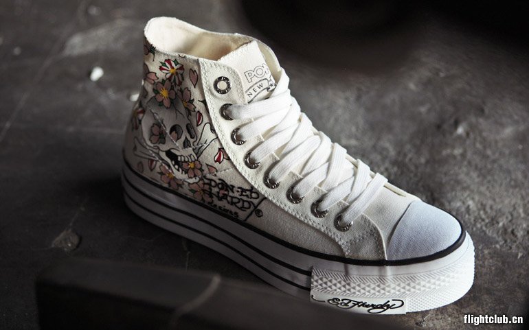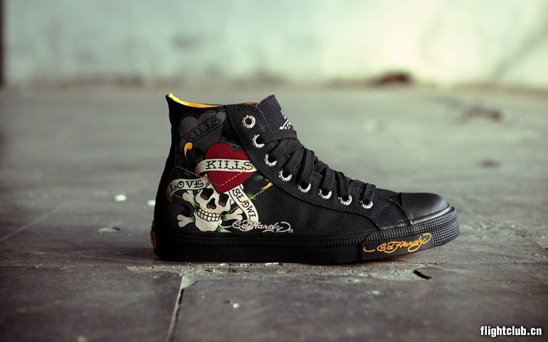 美国品牌PONY的经典shooter系列鞋款总是将摇滚及街头精神发挥的淋漓尽致,本次邀请到著名庞克摇滚品牌ED Hardy一同发表特殊联名款,以完美的制鞋工艺,将Ed Hardy的经典刺青图案以刺绣、印刷局部植绒等技巧,无落差的表现出摇滚精神! 本系列鞋款除中性的薄底款式外,另针对女性推出拉长完美比例的秘密武器流行厚底款,情侣鞋穿着绝对可轻易聚集众人目光!