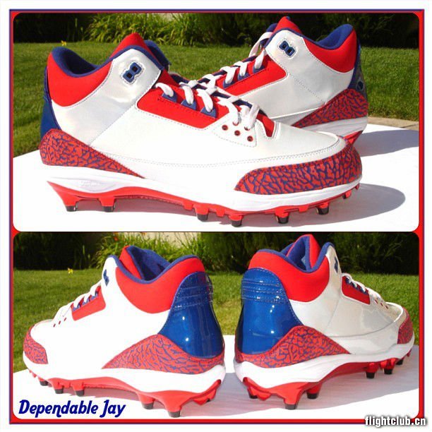 网上曝光一款Air Jordan 3橄榄球鞋PE,推测是为Terrell Owens于2010年明星碗时着用而打造,白色皮质鞋身搭配红色以及蓝色细节,前后附有红底蓝纹爆裂材质。若真的是为Owens在2010年时制作,因为他当时未能参加明星碗,那么此款是首次曝光的PE。