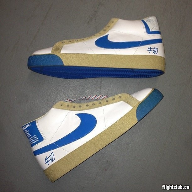 Fly滑板店因为全新上海卢湾限定Dunk Low Pro SB的发售而又火了一把,而呈现于眼前的这双则是07年时Nike为Fly创始人韩敏捷打造的“牛奶盒”Blazer Premium SB的样品版本。鞋身设计与市售版基本一致,硫化大底的色彩则稍有不同。