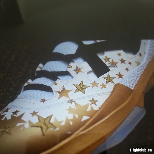 最初于今年一月披露、由英国艺术家Dave White设计的Jordan Melo M9迟迟没有露面,不过近日Dave White在网上曝出了首张实物局部谍照,或许也预示着这款鞋的市售已经临近。鞋款设计定稿由Melo在英国与Dave White见面喝茶时挑选决定,从谍照来看,鞋身以白色作为主色调配以黑色飞线,金色点缀于鞋头以及中底并辅以金色星星装饰鞋身,再搭配掺有金色亮片的水晶大底。此款合作版是为庆贺Anthony在2012伦敦奥运会对阵尼日利亚时单场破纪录拿下37分而特别打造。