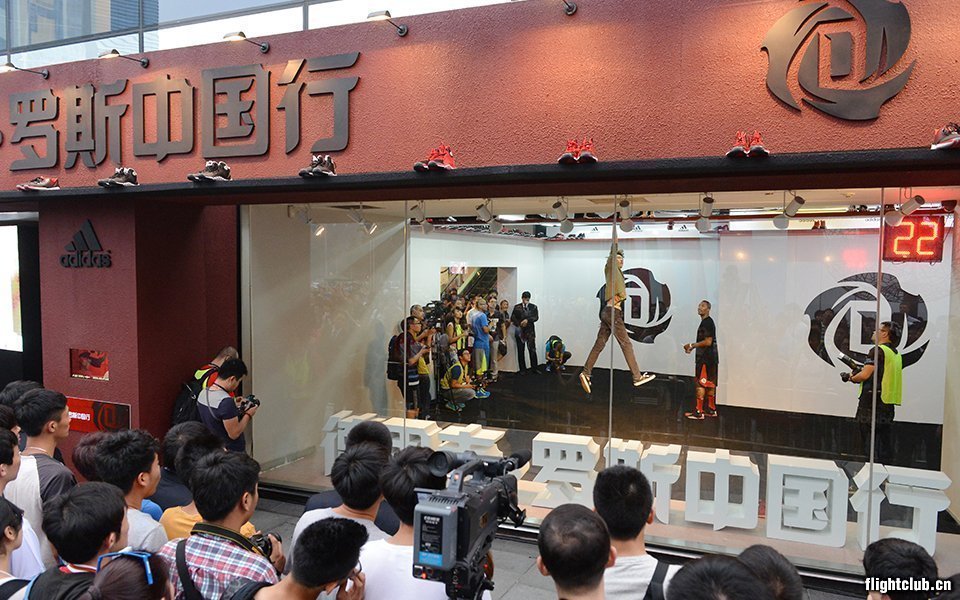 傍晚5时许的三里屯阿迪达斯旗舰店门前人头涌动。罗斯首先与阔别许久的媒体和球迷朋友分享了他再次来到中国激动的心情,并迫不及待地想要和中国篮球粉丝们一起“凌跃升空”,享受篮球乐趣。现场他亲自从等候的狂热粉丝中抽取了最后的10名幸运球迷,他们与前面已经会集的40名粉丝一起,获得了登高一跃的机会。接着,主持人便主动向大家介绍起了游戏规则:粉丝依次入场,在24秒内跳起拿鞋,只要能从和标准篮筐等高的3.05米的隔板上拿下罗斯的球鞋,这双罗斯战靴就属于他。而其中最令人激动的就是罗斯还将在球鞋上亲笔签下自己的名字以示鼓励。