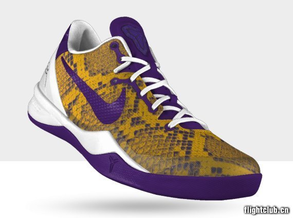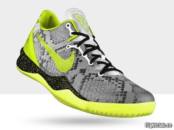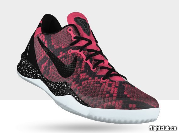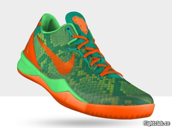 在Nike Basketball推出紫/薄荷色“响尾蛇纹”Kobe 8之后,NIKEiD也正式开启了Kobe 8 iD的响尾蛇纹选项。市售版的色彩将不会出现在NIKEiD的选项中,不过仍旧有火红/黑色、芒果黄/宫廷紫、闪黄/黑色、蓝绿色/荧光黄、亮粉/黑色、皇家蓝/鲜绿等搭配以供选择。