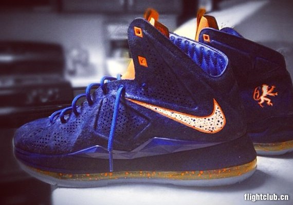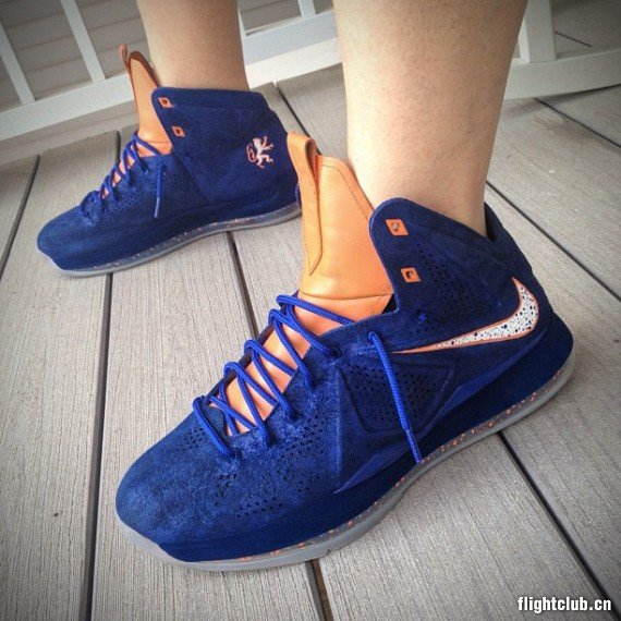 LeBron产品线中的“Hardwood Classic”系列配色可谓经典,蓝色以及橙色互换主色调的鸳鸯款式总让不少人痴迷,只可惜“Hardwood Classic”基本只限球员版。Mache Customs则选用LeBron X EXT打造了属于他自己的“Hardwood Classic”,鞋身麂皮染成皇家蓝色,鞋舌则染上橙色,另外在swoosh以及中底气垫部分辅以泼墨细节,整体效果颇为不错。