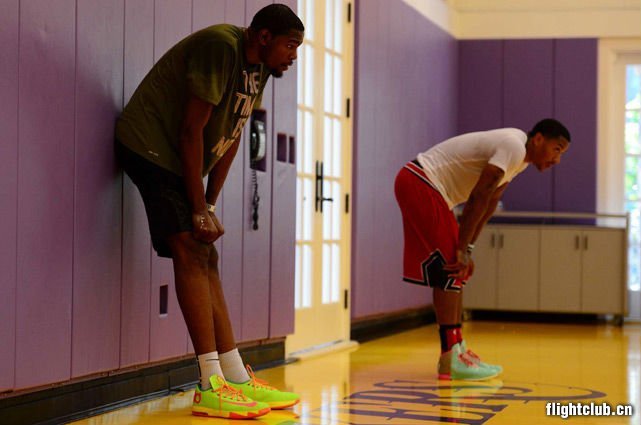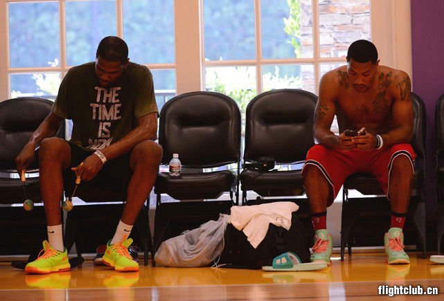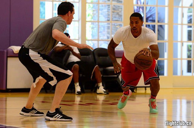 Derrick Rose已经做好准备重返赛场。上个月这位前MVP球员参加了Rob McClanaghan在洛杉矶举办的训练营,同时参与的还有Kevin Durant、Kevin Love、John Wall以及Brandon Jennings。当然了,场上的焦点自然还是从去年四月伤病归来的Derrick Rose,亲穿adidas D Rose 4亮相训练赛场。他脚上穿着的这双菘蓝绿搭配棕色以及粉色的版本即将发售。