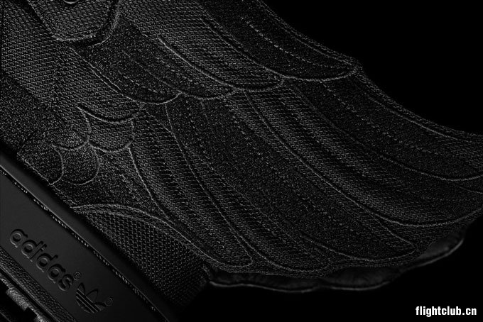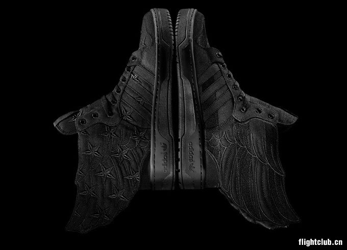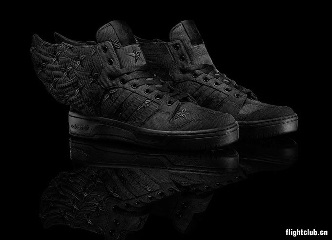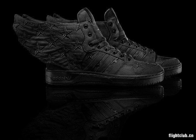 今年一月, A$AP Rocky 发布首张专辑 《Long. Live.A$AP》便一炮而红,这张专辑也深深吸引了 Jeremy Scott,因此 Jeremy Scott 在设计这款鞋履时便汲取了 专辑 《Long. Live.A$AP》的黑白色美国国旗封面为灵感,重塑了 JS Wings 2.0 这款经典翅膀鞋。鞋款采用了黑色尼龙布料打造鞋身,并以刺绣形式分别在两只鞋上注入星芒以及条纹的装饰,美国式的暗黑风格使得这款鞋履潮流味道爆棚。