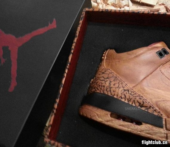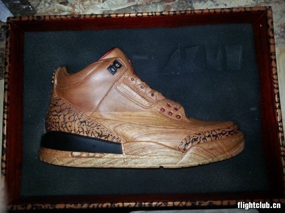 还记得那对青铜Air Jordan IV模型吗?其实它的本质仍然还是一双球鞋,不过眼前这个Air Jordan III就不同了。由Arnold Zpadaz雕刻,十足的木质材料,就连吊牌以及鞋盒也是用木头雕刻而出,逼真的鞋面质感可谓惊为天人。