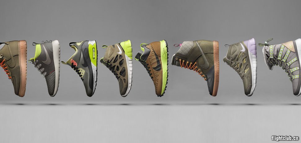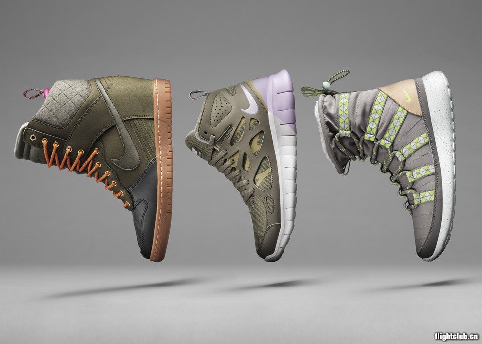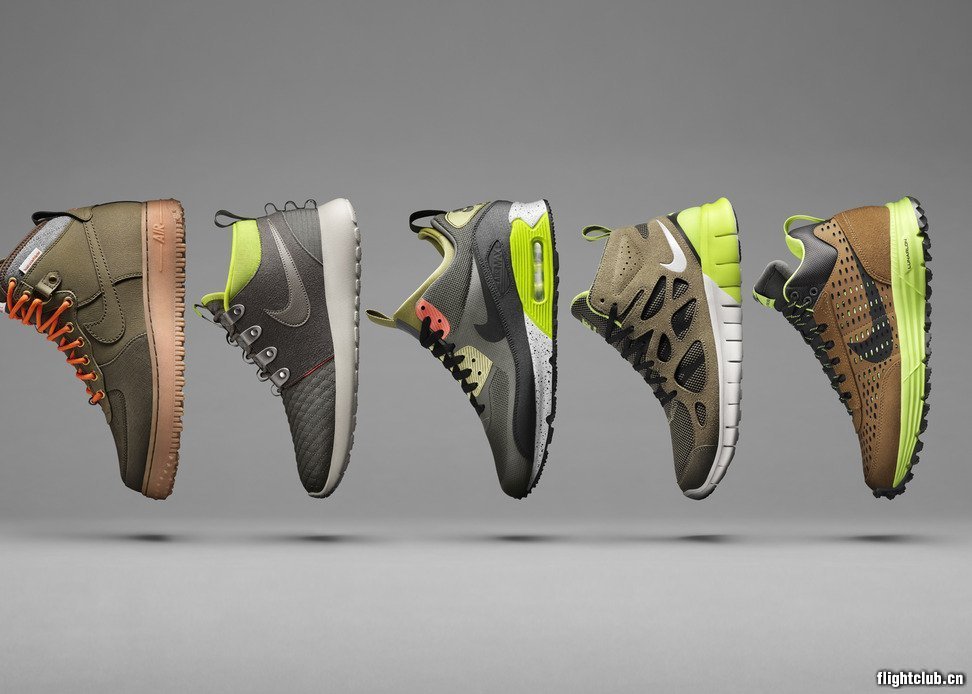 NikeSportswear正式发布全新靴款系列,以经典鞋款鞋型作为蓝本,在增加重量、牵引力以及防水功能的基础上重新设计成靴款外观,令你足以应对秋冬季的一切天气变化。此系列包括Air Force 1 Duckboot、Air Max 90 SneakerBoot、Free Run 2 SneakerBoot、Lunar LDV SneakerBoot、Roshe Run SneakerBoot、WMNS Roshe Run Hi SneakerBoot以及WMNS Dunk Sky Hi SneakerBoot七双鞋款。
