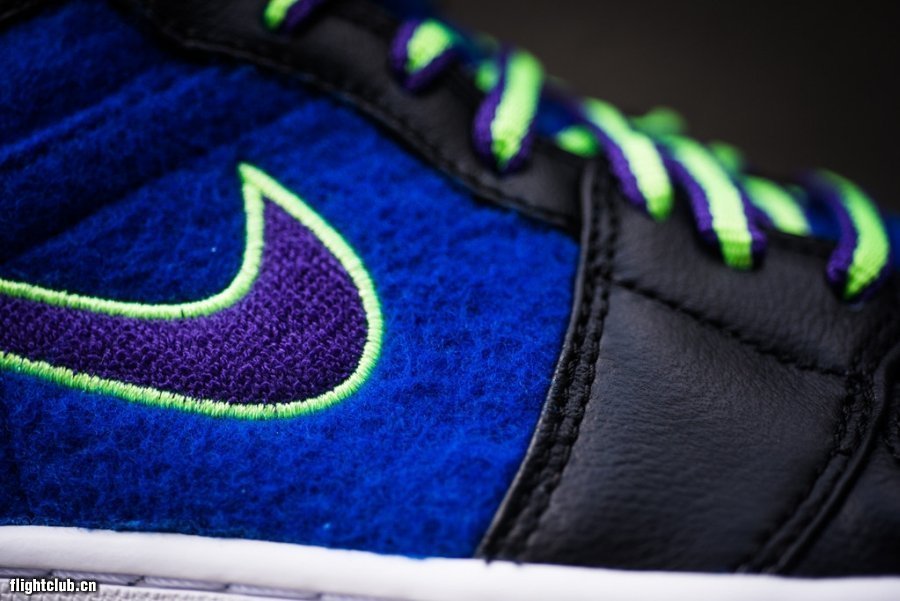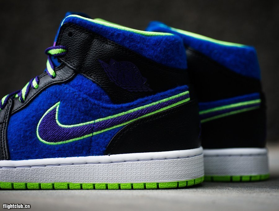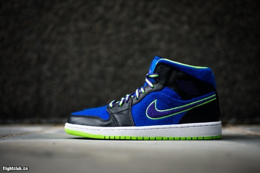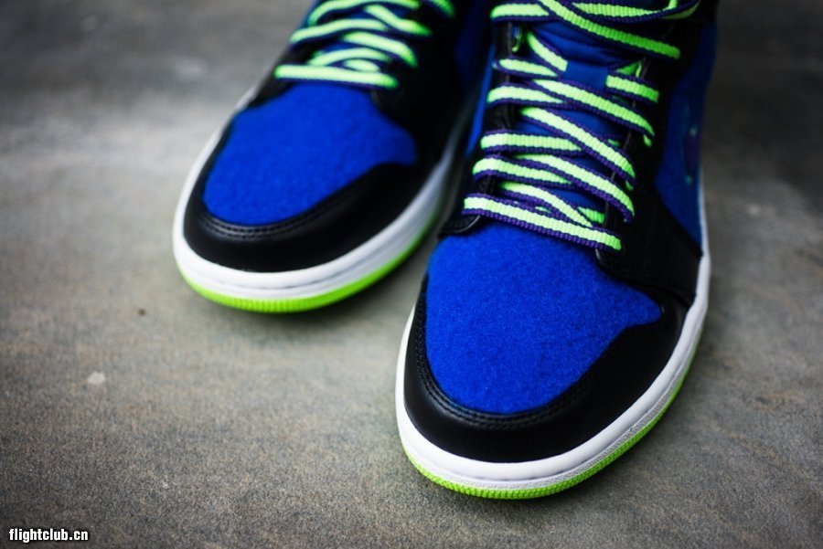 在Jordan Brand的2013年冬季新品发布会上,我们在Bel Air系列里看到了三双Air Jordan 1,眼前这款便是其中之一。皇家蓝色绒面材质搭配黑色皮革,配上双色鞋带再辅以电柠绿色点缀,货号633206-040,现已发售。