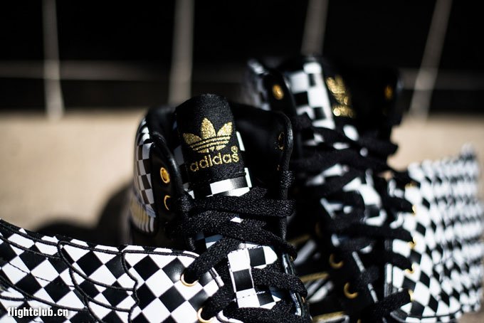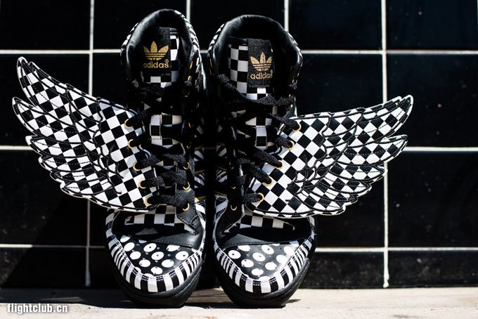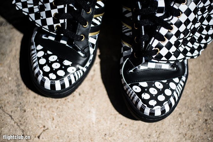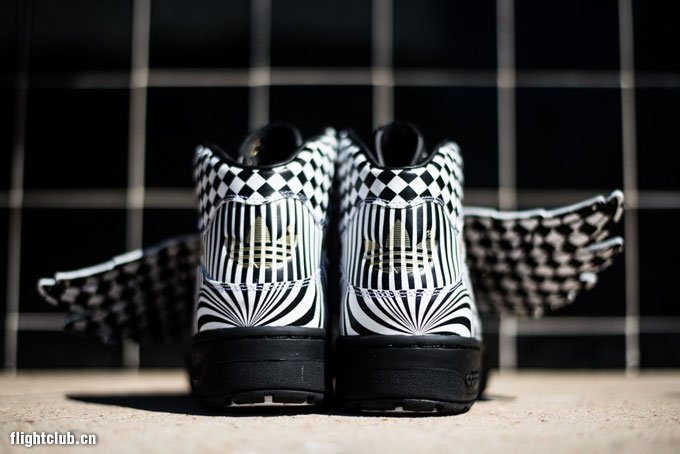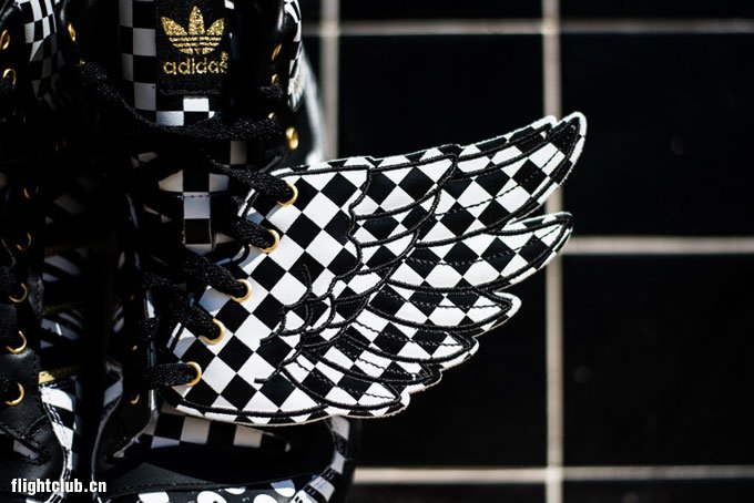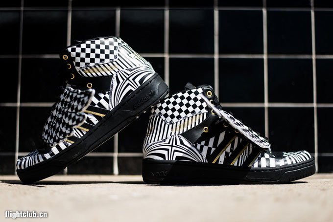 继续为大家带来 Jeremy Scott x adidas Originals 本季新品的消息,此次鬼才设计师 Jeremy Scott 又将自己天马行空的创造力淋漓尽致地体现,这款 Jeremy Scott x adidas Originals JS Wings Op art 采用了视觉艺术为设计灵感,以黑白相间的格纹、波点、竖条纹等多种视觉艺术图案覆盖鞋身,营造出了强烈的视觉冲击力,最后再配以金色的 Logo 点缀,华丽无比。鞋款售价220美金,将于未来上架发售。