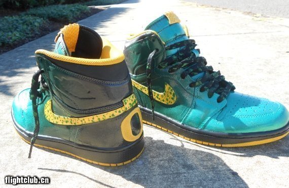 Zadeh Kicks选用Air Jordan 1作为设计模板,鞋身染上深橄榄绿以及水绿色并呈现渐变效果,黄色点缀细节,鞋舌绣标更换成蛇纹材质,swoosh附上绿色泼墨,后跟则不忘绣上“O”字logo。