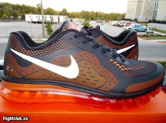 全新Nike Air Max+ 2014鞋款将于明年春季正式发售,网上有卖家率先放出样品售卖。犹如地质图般的鞋面纹理是其最大的特色,不同区域以不同色彩以及网面形态呈现,此款样品以黑色网面搭配橙色底色并配上橙/红渐变全掌Max Air。