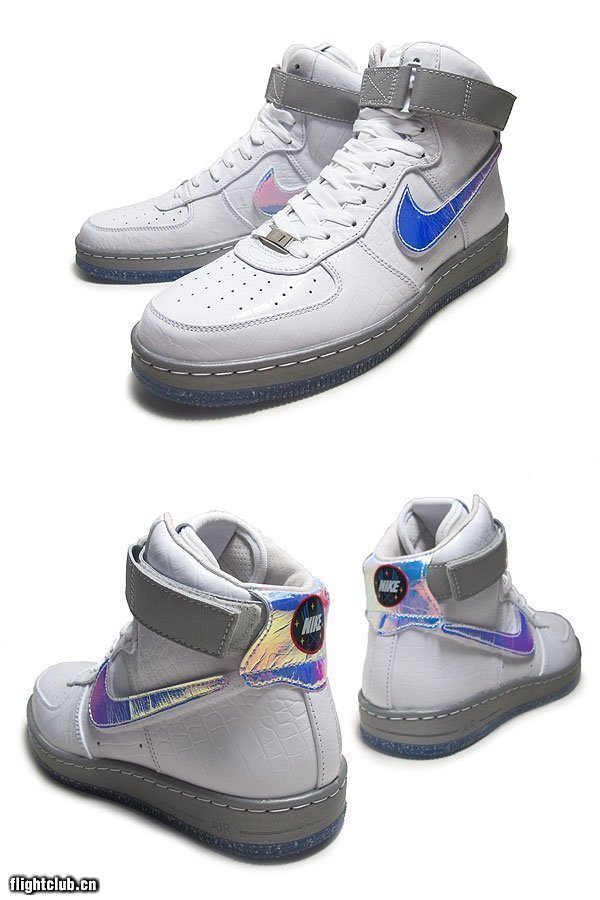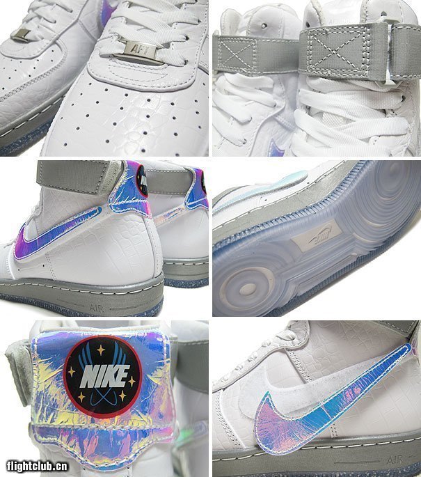 这双Nike Air Force 1 Downtown Hi"Hologram”,鞋身由白色鳄鱼纹打造,搭配带有全息效果的后跟和可拆卸Swoosh。值得一提的是,此鞋后跟还印有特别的“NASA” logo。此鞋货号:632360-100,现已发售。