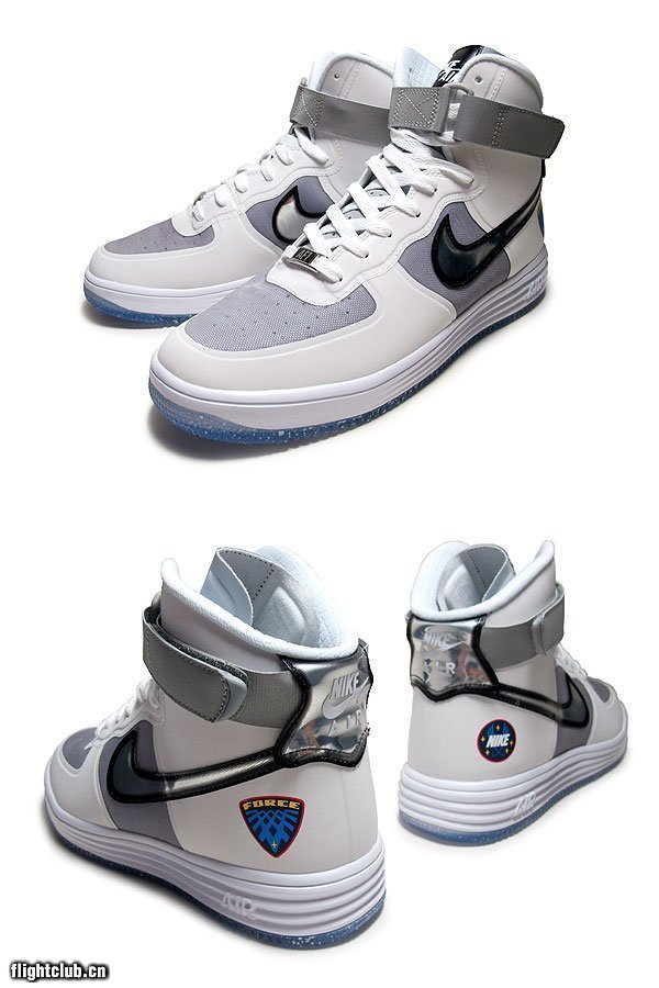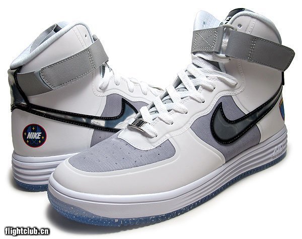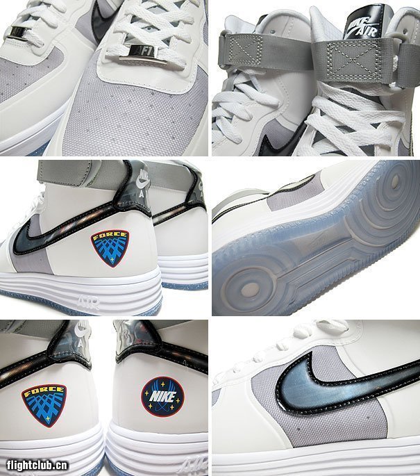 Nike Lunar Force 1 High Wow QS,鞋身由白灰两色搭配而成,鞋面上的Swoosh与后跟均采用反光材质打造。加上后根源自NASA标志的特别logo,整双鞋款颇有月球靴的感觉。此鞋现已发售,货号:632359-100-03。