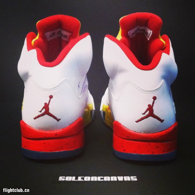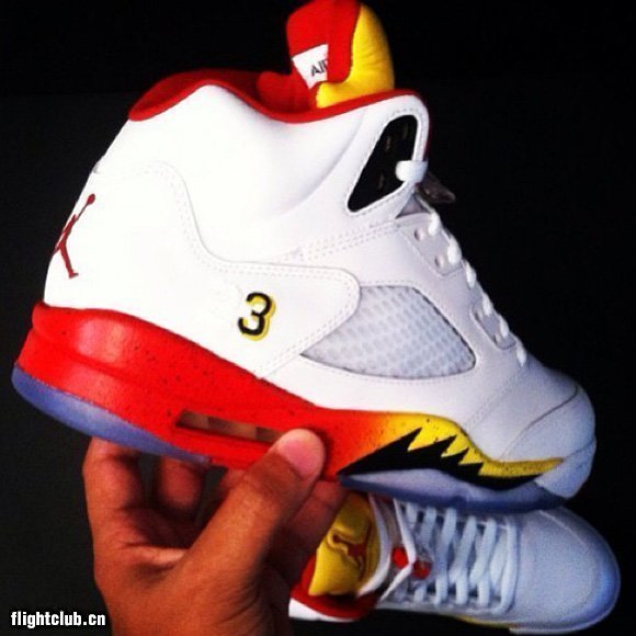 我们看过不少Jordan Brand为旗下代言人打造的Air Jordan 5 PE,不过有一个人的版本,若非早期样品曝光,我们基本没有希望看到他的PE出现,那就是D-Wade。不过没关系,这样的PE可以通过私人定制的方式实现。SoleOnCanvas保留鞋身白色皮革,鞋舌染上黄色,中底火焰红/黄色制作出渐变效果并附上黑色泼墨,后跟绘有立体背号“3”,完完全全的热火主场主题。