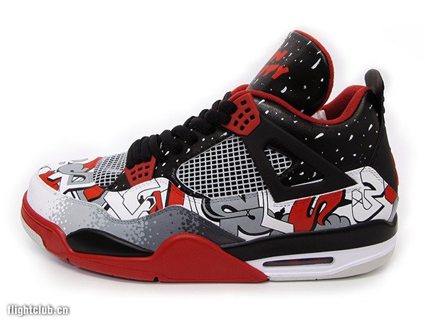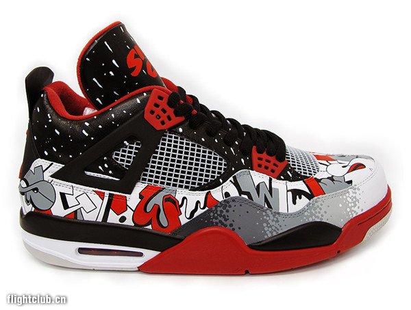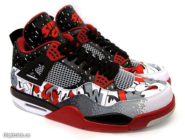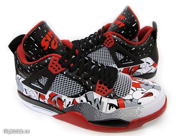 这已经不是Mr. Sekure D以“罪恶都市”为主题定制的第一双球鞋,早在2008年他就开始以“罪恶都市”为主题定制球鞋了,每双都收到了极大的赞誉。此次Mr. Sekure D又带来了Air Jordan IV “罪恶都市”,正双鞋延续了之前Air Jordan III的风格,以白色鞋面为基础,搭配款张的“Sin City” 字样的涂鸦装饰,效果炫酷。