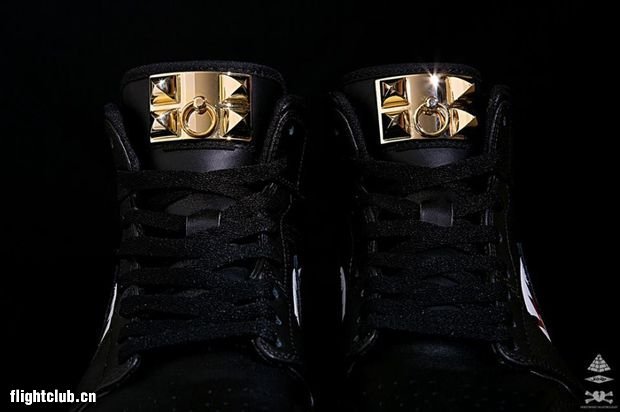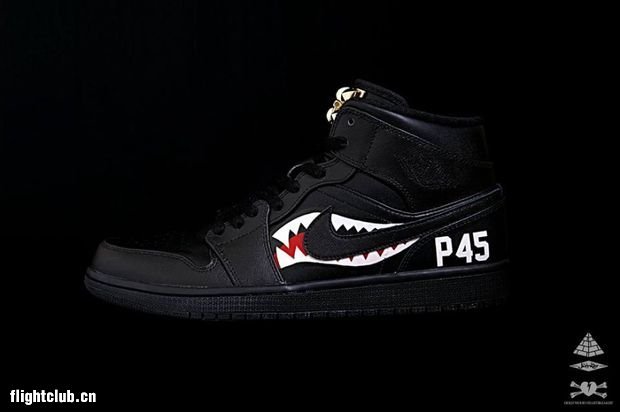 台湾球鞋定制者Jumper联手Hollywood Heart共同打造了眼前这双名为“P-45”的Air Jordan 1。在纯黑色鞋身的外侧绘以鲨鱼齿,后跟写有P45字样,鞋舌附上金色装饰物,极富鹰派军事味。