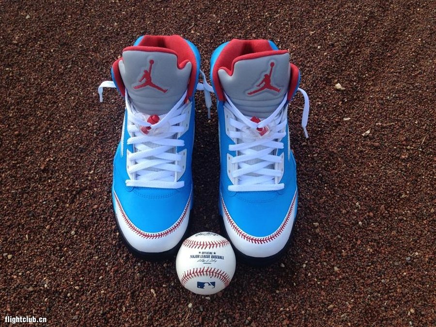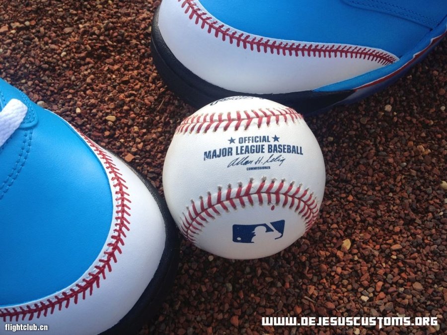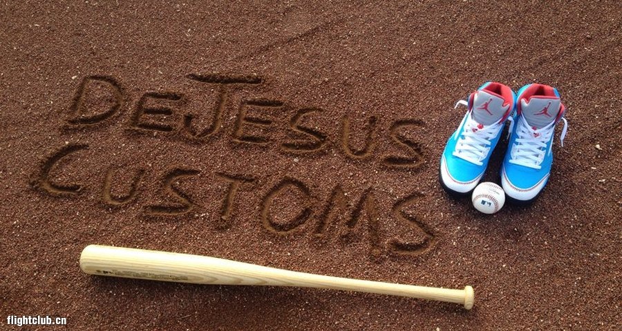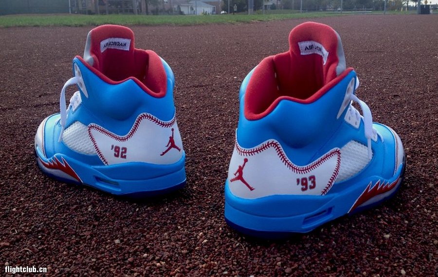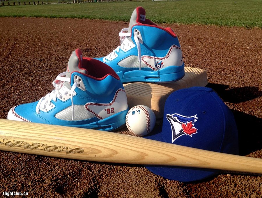 DeJesus Customs选用Air Jordan 5做为模板并以“多伦多蓝鸟队”作为灵感打造了一双定制作品。鞋身色调源自蓝鸟队2012年的全新队标,蓝鸟的蓝色配上加拿大枫叶的红色,92以及93则提醒着人们这支队伍曾连续两年赢得世界系列赛冠军的荣誉时光。