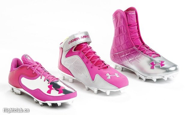 在10月剩下的比赛中,包括Arian Foster、Cam Newton、NaVorro Bowman、Torrey Smith以及Brian Cushing等人在内的UA旗下NFL球员都将各自穿上高、中、低帮“防治乳癌宣传月”别注系列橄榄球鞋,粉色鞋身搭配银灰色以及镜面银色大底,极为醒目。