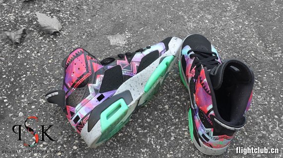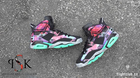 明年Air Jordan 6的推出将异常频繁,而现在不少喜欢定制球鞋的爱好者们已经坐不住了,比如Peculiar Kinetics,保留鞋身部分黑色牛巴革,绘以黑纹渐变底的阿兹特克文化图腾,神秘感十足。