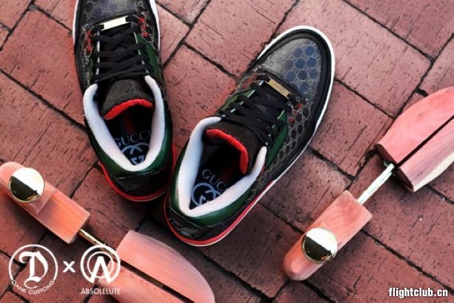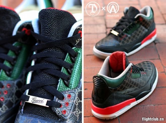 今天为您带来定制品牌 Dank Customs 与 Absolelute 联合打造的 Air Jordan 3 “Gucci” 巧妙的设计将眼前的 Air Jordan 3 装点的十分别致,尽显奢华内涵,在突显质感的黑色皮革材质上运用 Gucci 品牌传统的红绿色进行装饰,值得一提的是在黑色皮革材质之上运用了压花装饰将 “GG” 字样 Logo 进行展示,将奢华进行了全新的定义。