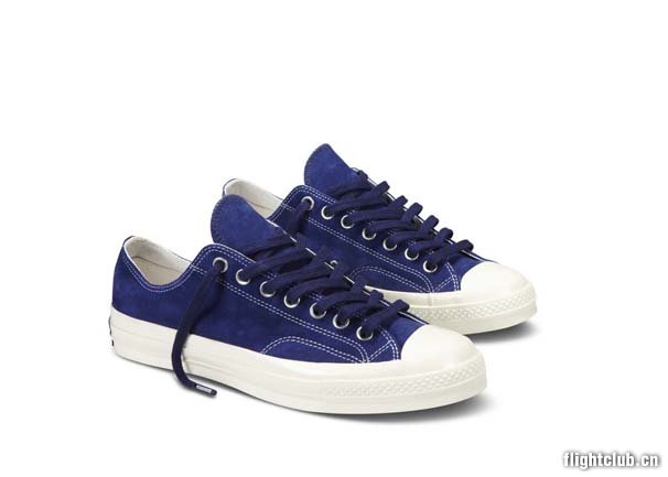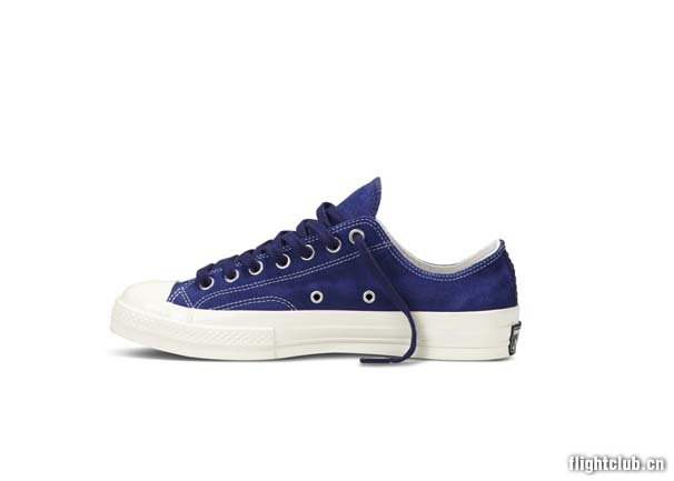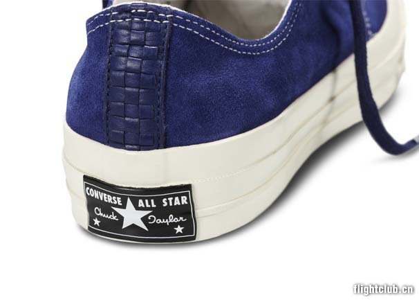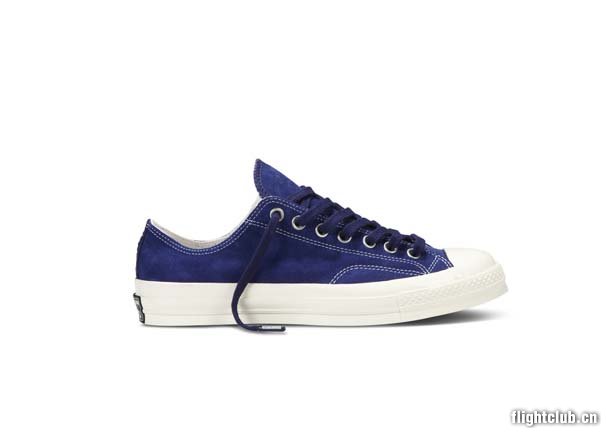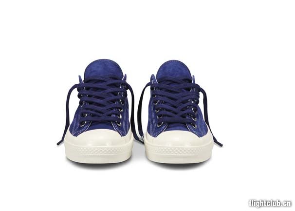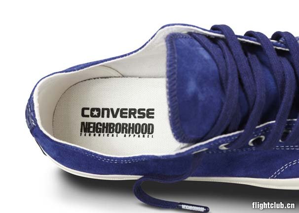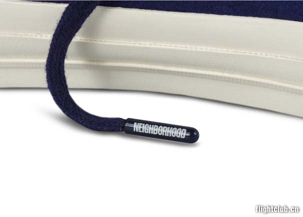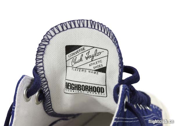 率先登场的这款 NEIGHBORHOOD x CONVERSE First String Chuck Taylor 70 Ox 选用了皇家蓝色的麂皮材质构成鞋身,后跟则搭配编制材质呈现,并注入白色车线细节,细节处的精心设计无不体现了 NEIGHBORHOOD 引以为傲的机车风格。而 NEIGHBORHOOD 的个人标志则低调地出现在鞋带头、鞋垫以及鞋舌内侧部位。