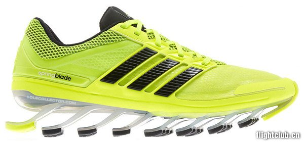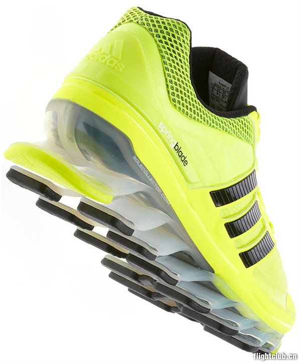 adidas今年夏天发布的高科技跑鞋Springblade 可谓中底技术的又一场革命,十六个聚合物簧片完全取代了传统的EVA中底,为跑手提供足够的承托力之余,更有效地将能量迅速回馈到脚掌,提供了流畅的爆发力。如今这款Springblade 携手名为“Electricity”的新配色登陆adidas线上店铺,售价180美元。
