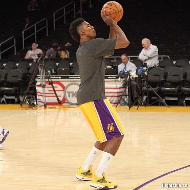 新赛季的第一场洛城德比将于北京时间10:30正式开打,虽然从球队实力来看快船比湖人胜出不少。但从球鞋装备来看,湖人已经赢了!因为他们有尼克杨!尼克杨今日上脚了一双Air Jordan 4“Lightning”,与湖人金色的主场队服十分般配!
