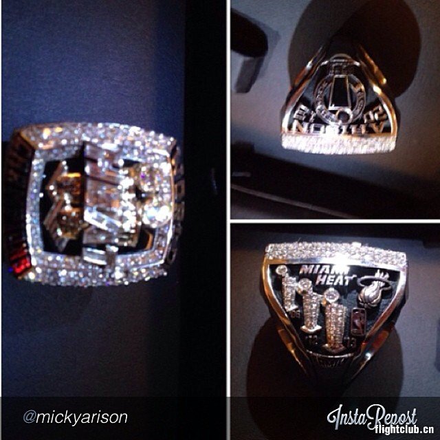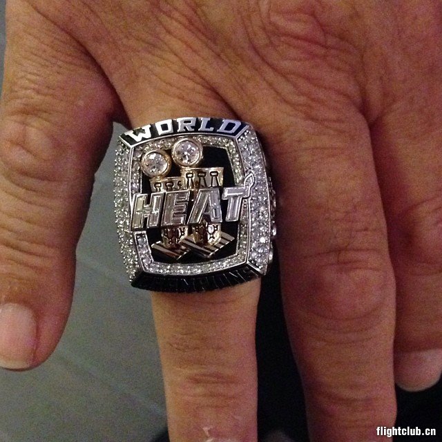 迈阿密热火队不但在今早领取了上赛季的总冠军戒指,还在主场战胜公牛拿下了赛季第一胜。而心情大好的热火队老板Micky Arison也在Instagram晒出了热火队的总冠军戒指。除了布满钻石之外,戒指上还刻有冠军奖杯及“World”、“Champion”等字样,尽显奢华。