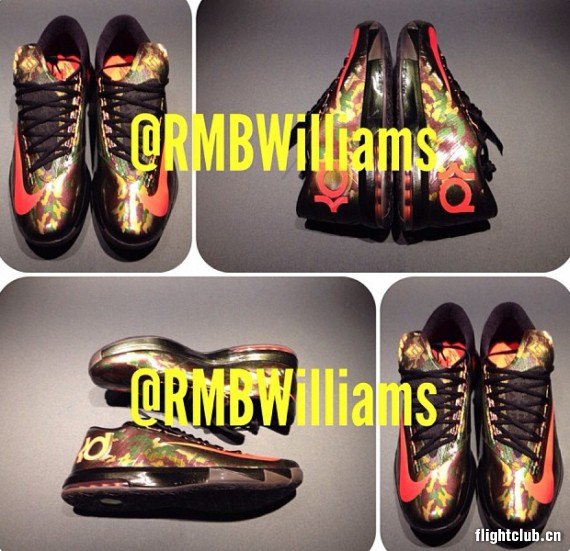 杜兰特的第六代个人战靴 Nike KD6 新配色不断,此番,又一款迷彩版本的 KD6 在 Instagram 上释出。鞋款鞋身以极富光泽的材质打造,再配以极具迷惑性的迷彩图案加持,最后注入猩红色的 Swoosh 以及 KD Logo,大底则为棕色呈现,让人感觉十分新颖。目前暂时还没有这款配色的发售消息。