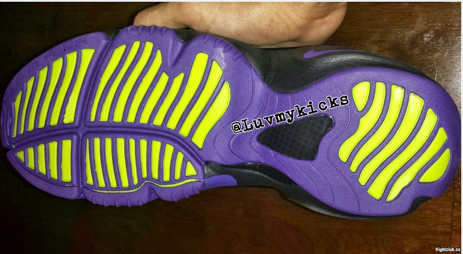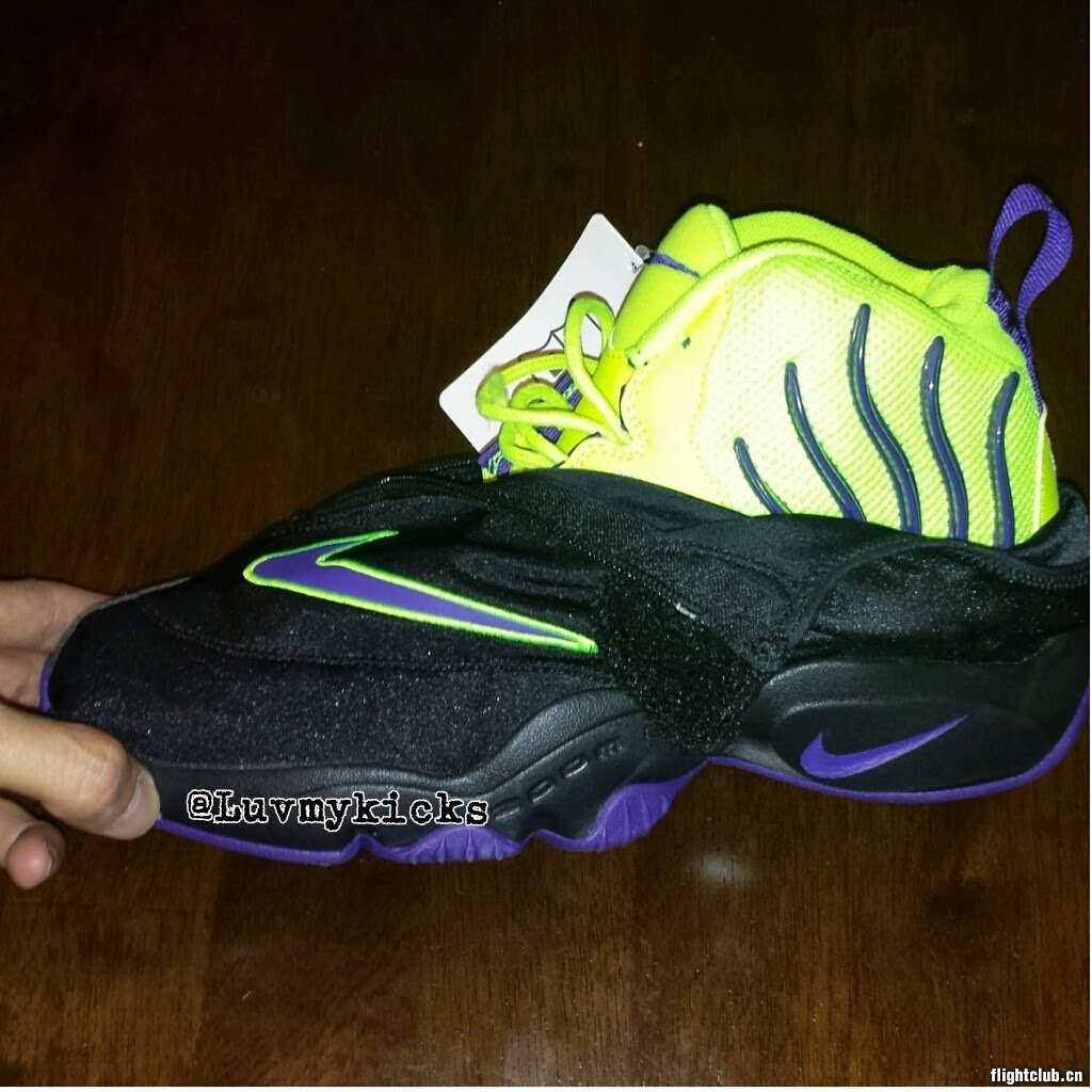 Nike Zoom Flight 98 The Glove曝光全新“Joker”配色,黑色人造织物鞋身搭配荧光绿色内衬并辅以紫色细节点缀。值得一提的是,佩顿之子Gary Payton JR 已经提前上脚此鞋。